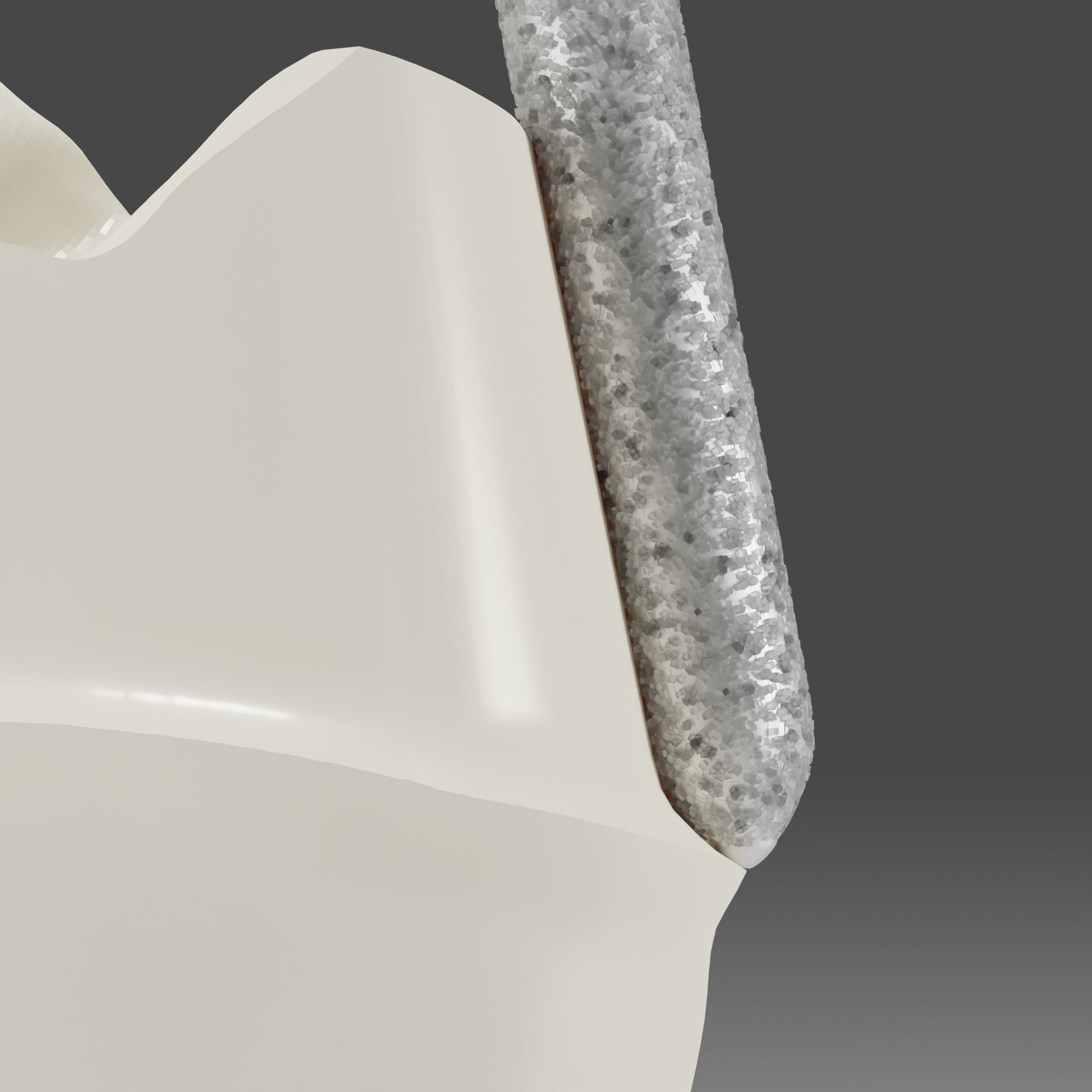 Die Lösung des Problems ist eigentlich ganz logisch. Das Problem lag im vorderen Bereich der Werkzeugspitze, weshalb ich diesen Bereich durch eine Teilbelegung derselben aus dem Spiel genommen habe. Dadurch wurde ein Instrument geschaffen, welchem aufgrund seiner Geometrie also nur noch Positiv-Bereich zur Verfügung steht. Daher können mit diesen Instrumenten auch nur ausschließlich Hohlkehlen präpariert werden, das unbeabsichtigte Anlegen von Dachrinnen ist somit nicht mehr möglich.